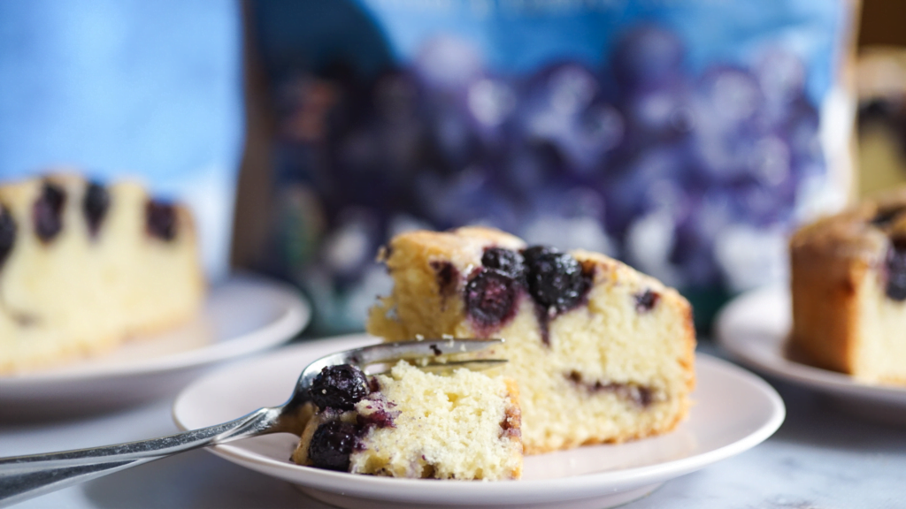 Spread half of the batter evenly into the prepared pan. Add in 1 cup of the frozen blueberries evenly into the batter. Use an off-set spatula to gently push the blueberries into the batter.
